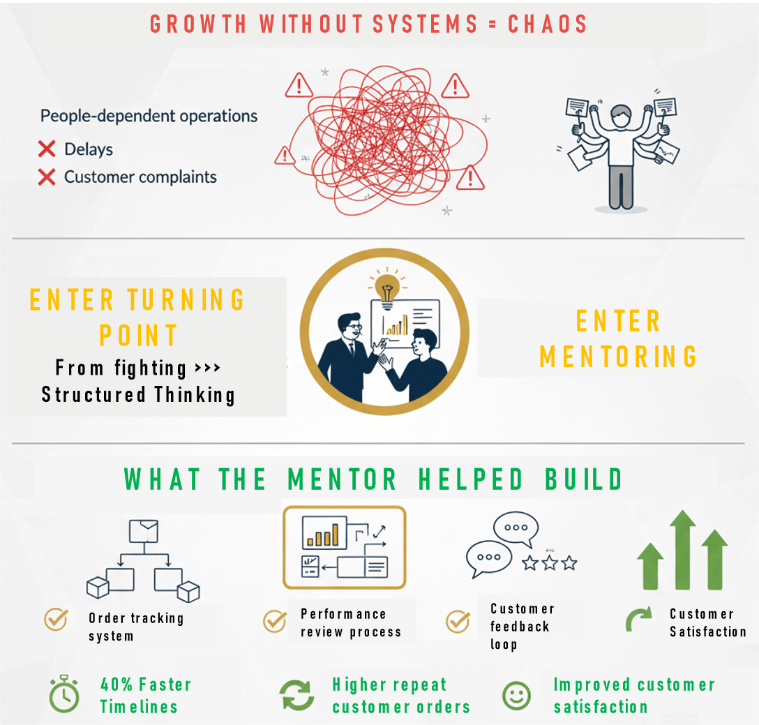 A home decor brand in Jaipur struggled with delayed deliveries and rising customer complaints. With a mentor's support, the business implemented simple systems for order tracking, performance reviews, and customers feedback. Within months, delivery timelines improved by 40%, and repeat customer orders increased significantly.