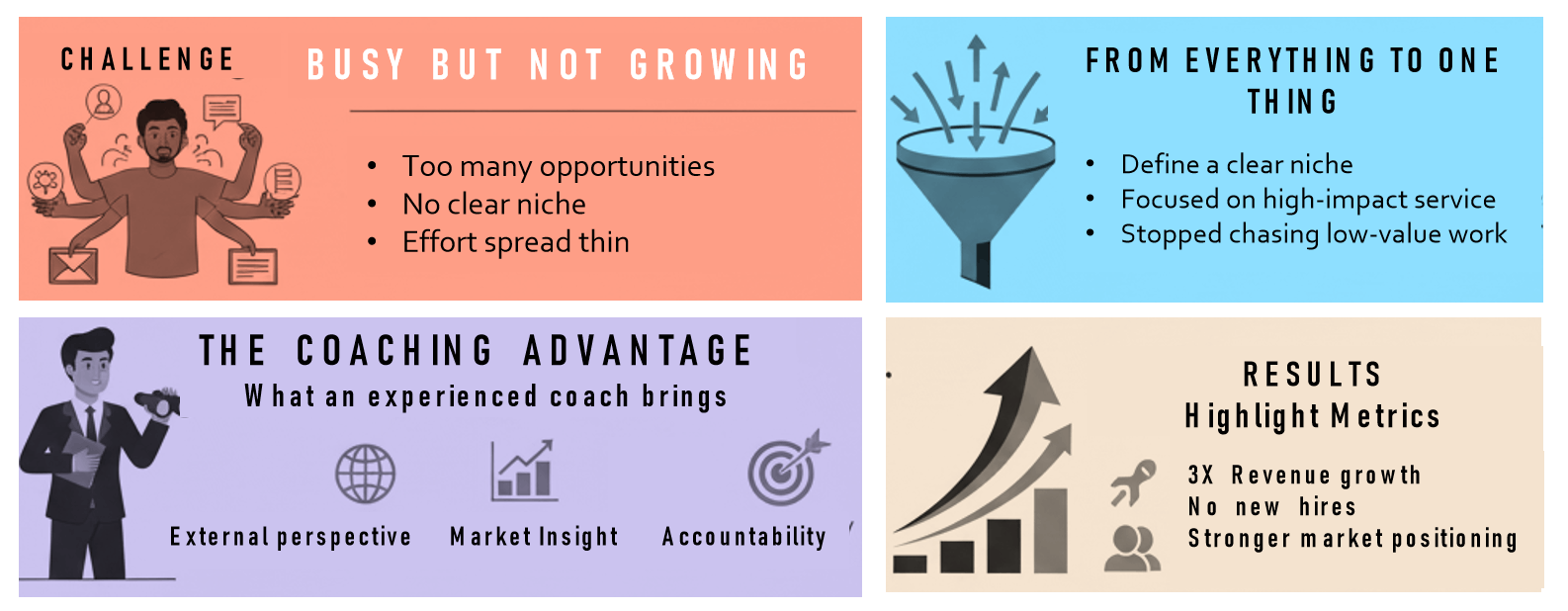 A digital agency in Bangalore worked with a business coach to define a clear niche. Instead of chasing every opportunity, they focused on high-impact services. Within one year, the agency tripled its revenue without adding new staff – purely through strategic focus and better positioning.