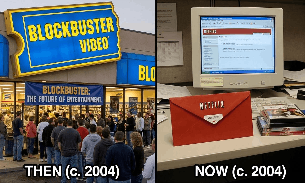 In 2000, Netflix’s founders approached Blockbuster with an offer to sell their entire business for $50 million. Blockbuster’s leadership reportedly laughed them out of the room. To them, Netflix was a niche experiment, no match for the scale and success of physical retail.
