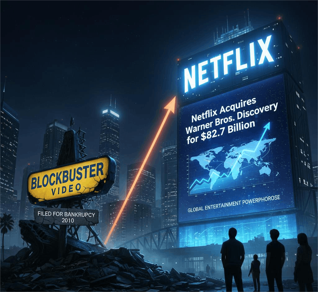 The result is well known. Netflix became a global entertainment powerhouse that reshaped how the world consumes content. The recent announcement that it reached an agreement to buy Warner Bros. Discovery (WBD)'s studio and streaming assets for about $82.7 billion is another testament to how far Netflix has come. On the other hand, Blockbuster, once synonymous with movie nights, filed for bankruptcy in 2010. The opportunity didn’t disappear – it simply moved to someone willing to act on it.