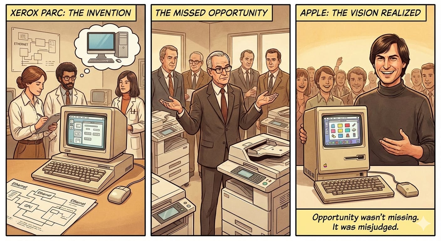 When Steve Jobs visited PARC in 1979, he immediately grasped what Xerox could not. Apple did not invent the mouse or the GUI, but it understood their future value. Apple refined these ideas, built consumer-friendly products around them, and brought them to the mass market through the Macintosh.