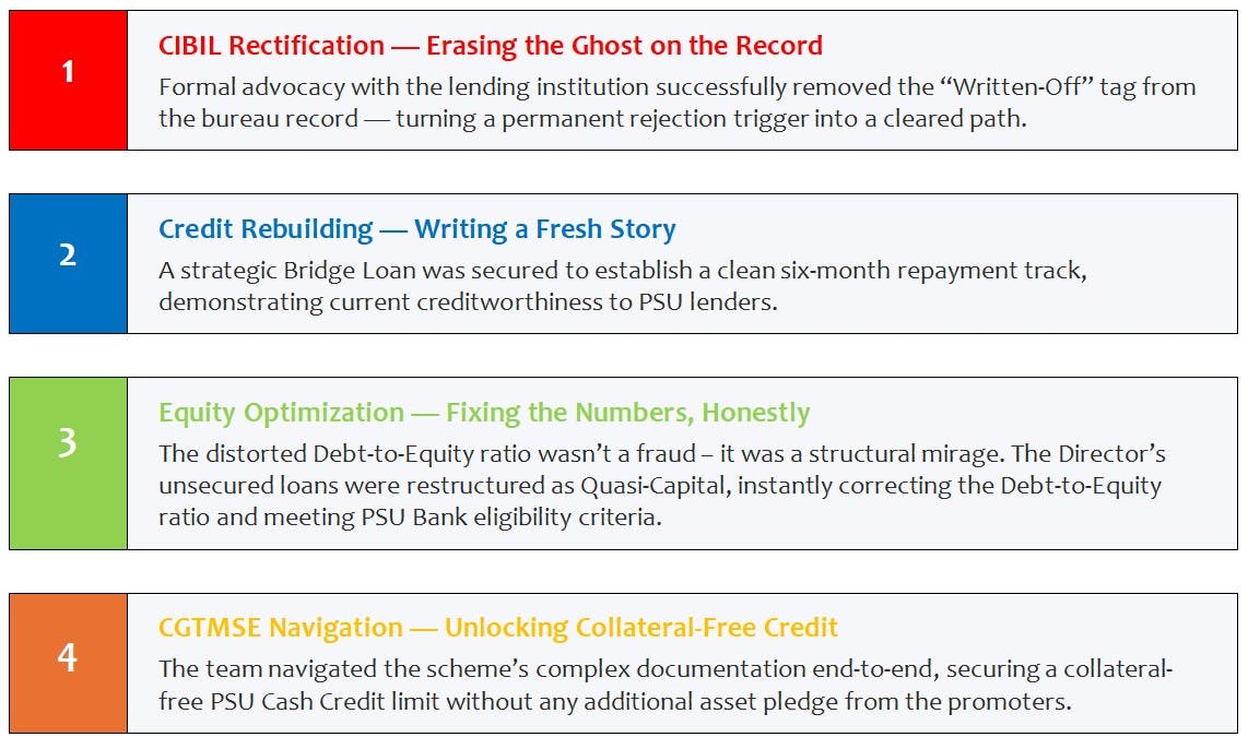 When the promoters reached the head of our ArthaVerse’s financial advisory team, they weren’t looking for another loan application. They needed someone to solve the problem at the root – not paper over it. Rather than submitting a standard credit proposal, the team designed a four-step credit reconstruction plan to transform the client from a lender’s liability into a premium borrower.